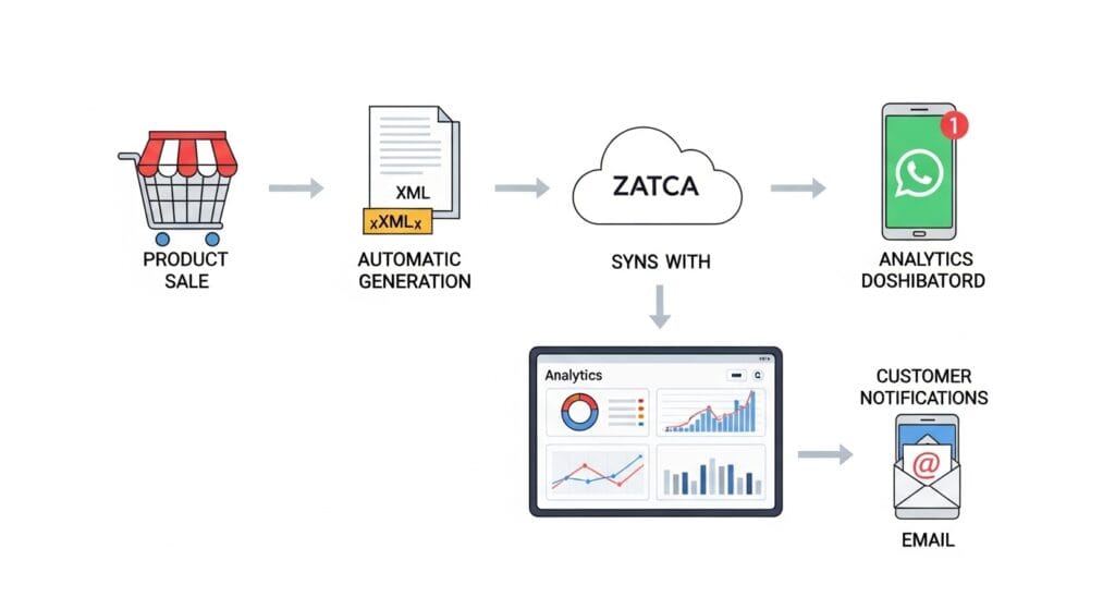 الالتزام الكامل بمعايير ZATCA دعم كامل للمرحلتين الأولى والثانية، بما في ذلك الفواتير بصيغة XML/QR.